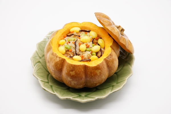 - ข้าวอบฟักทอง เลือกใช้ฟักทองพันธุ์ข้าวตอกมินิ ซึ่งเป็นวัตถุดิบจากเกษตรพื้นบ้าน มีเนื้อเหนียว หวานมัน และมีผิวเรียบเนียนนำมาอบพร้อมกับข้าวที่นำมาผัดกับเห็ดหอม ถั่วแระ แปะก๊วย และพริกหวาน มีรสชาติเค็ม เพื่อตัดกับรสหวานของฟักทอง หลังนำมาอบจะสามารถทานได้ทั้งลูก