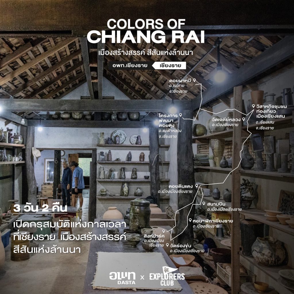 - COLORS OF CHIANG RAI เมืองสร้างสรรค์ สีสันแห่งล้านนา ชื่นชมวิถีชีวิตแห่งล้านนา ไปกับการลงพื้นที่คลุกคลีชุมชนชาติพันธุ์ ท่ามกลางบรรยากาศของธรรมชาติที่รายล้อม พร้อมผจญภัยไปในดินแดนแห่งธรณีวิทยา และตำนานแห่งขุนเขา