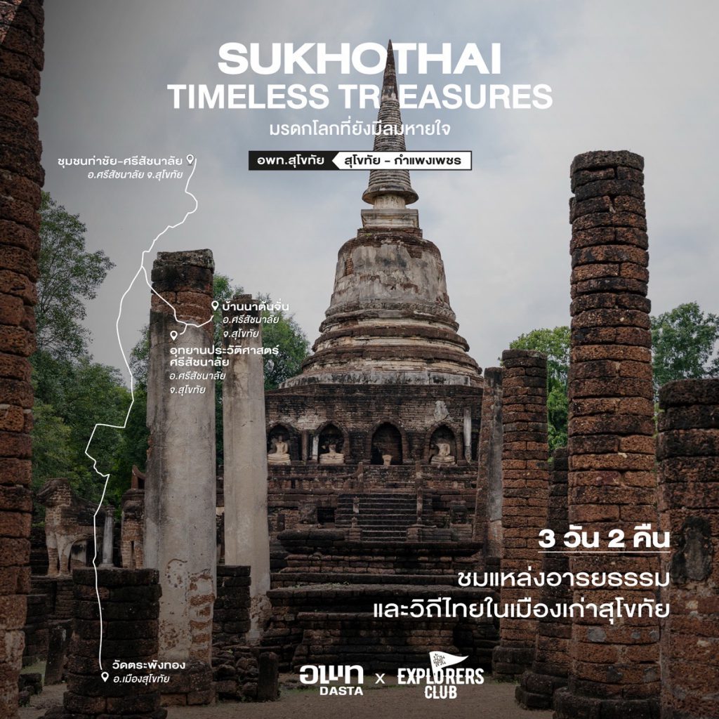 - SUKHOTHAI TIMELESS TREASURES มรดกโลกที่ยังมีลมหายใจ ชมเมืองเก่าเล่าเรื่องประวัติศาสตร์ ที่สุโขทัยผ่านกิจกรรมสุดสนุกตลอดทริป ชมโบราณสถาน แวะพักกับชุมชนขนาดกะทัดรัด ที่ใช้คำว่าน่ารักได้อย่างฟุ่มเฟือย และฝากท้องกับเมนูอาหารท้องถิ่นที่ทำให้ “สุโขทัย” กลายเป็นเมืองท่องเที่ยวยั่งยืน 1 ใน 100 แห่งของโลก