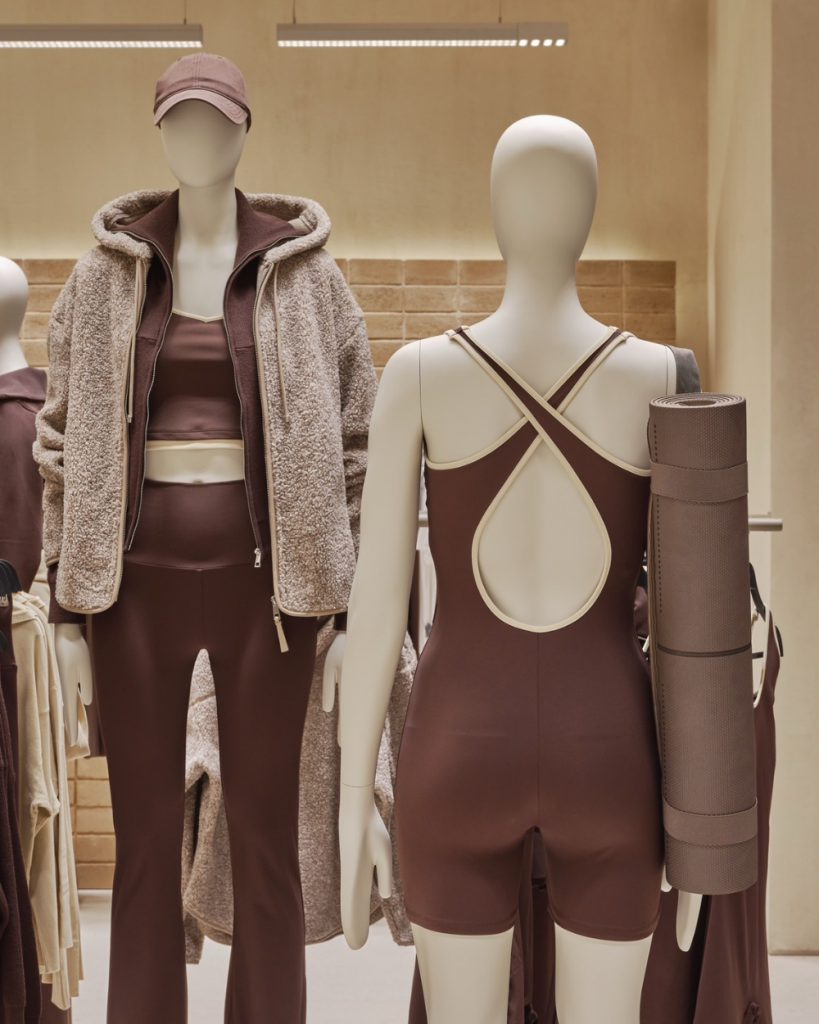 ด้านโครงสร้างสถาปัตยกรรมและวัสดุ ความอบอุ่น ผิวสัมผัสจากธรรมชาติ และแสงสว่าง คือองค์ประกอบสำคัญ ภายในร้านจึงเลือกใช้เป็นพื้นกระเบื้องพอร์ซเลนเพื่อให้เข้ากับวัสดุที่คัดสรรมาอย่างพิถีพิถัน โซนต้อนรับโดดเด่นด้วยผนัง earth-block งานแฮนด์คราฟต์ สะท้อนตัวตนของแบรนด์และชูภาพลักษณ์ความเป็นแบรนด์ผู้นำเทรนด์ Athleisure ตั้งแต่ก้าวแรกที่เข้าสู่ร้าน