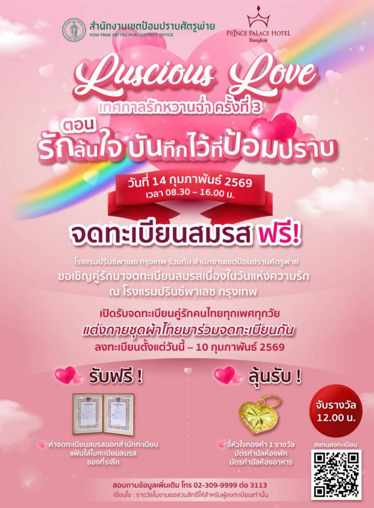 ในปีนี้ โรงแรมฯ ได้รับความร่วมมือจาก สำนักงานเขตป้อมปราบศัตรูพ่าย ในการอำนวยความสะดวกด้านการจดทะเบียนสมรสอย่างถูกต้องตามกฎหมาย โดยกิจกรรมจะจัดขึ้นในวันเสาร์ที่ 14กุมภาพันธ์ 2569 เวลา 08.30 – 12.00 น. ณ ห้องปรินซ์บอลรูม โรงแรมปรินซ์พาเลซ กรุงเทพ