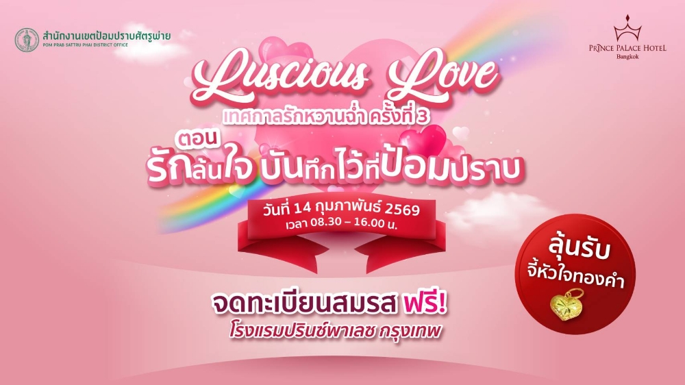 จดทะเบียนสมรสฟรี! พร้อมลุ้นรับจี้หัวใจทองคำ โรงแรมปรินซ์พาเลซ กรุงเทพ ขอเชิญคู่รักร่วมเฉลิมฉลองเทศกาลแห่งความรัก กับกิจกรรมจดทะเบียนสมรสฟรี เนื่องในวันวาเลนไทน์ ประจำปี 2569