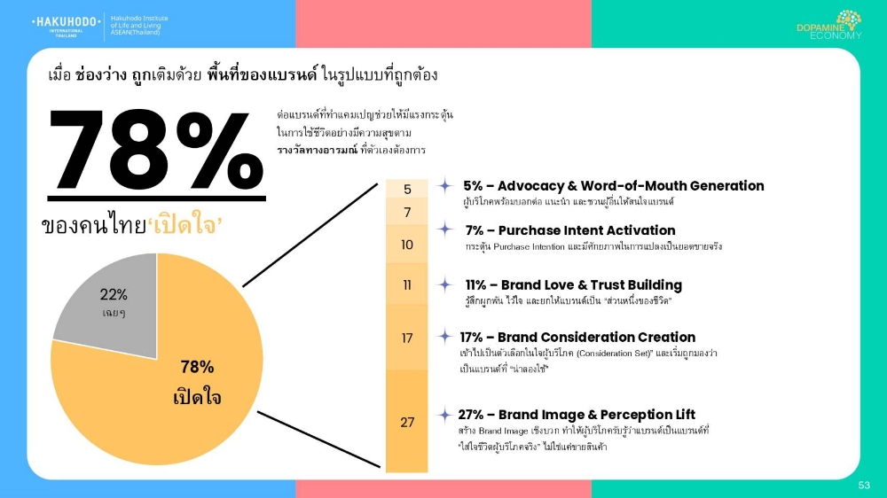 สถาบันวิจัยความเป็นอยู่ฮาคูโฮโด อาเซียน (ประเทศไทย) เปิดรายงานวิจัย”Dopamine Economy” เผยดัชนีความสุขคนไทยดิ่งต่ำสุดในรอบ 3 ปีชี้เทรนด์ “พลังใจ” กลายเป็นหน่วยมูลค่าใหม่ของตลาด