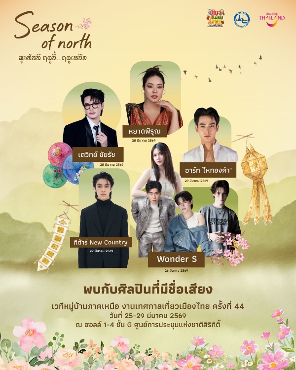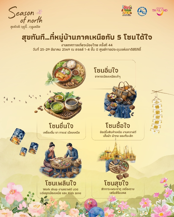 มาร่วมสัมผัสประสบการณ์ “สุขทันที…ฤดูนี้ฤดูเหนือ” ที่โซนหมู่บ้านภาคเหนือ ภายในงานเทศกาลเที่ยวเมืองไทย ครั้งที่ 44 ระหว่างวันที่ 25 – 29 มีนาคม 2569 เวลา 10.00 – 21.00 น. ณ ฮอลล์ 1 – 4 ชั้น G ศูนย์การประชุมแห่งชาติสิริกิติ์ กรุงเทพมหานคร