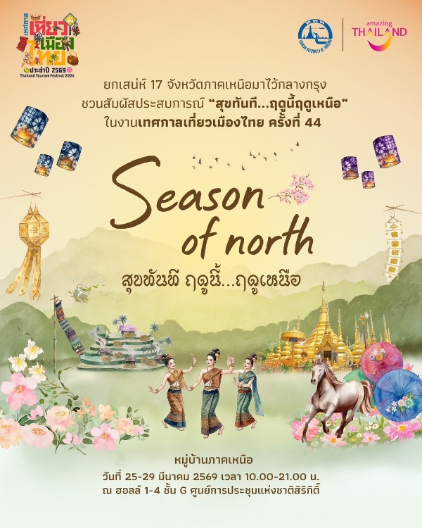 การท่องเที่ยวแห่งประเทศไทย ภูมิภาคภาคเหนือ สร้างปรากฏการณ์ครั้งใหญ่ เนรมิต “หมู่บ้านภาคเหนือ” ภายใต้แนวคิด “SEASON OF NORTH 2026: สุขทันที…ฤดูนี้ฤดูเหนือ” ภายในงานเทศกาลเที่ยวเมืองไทย ครั้งที่ 44 ระหว่างวันที่ 25 – 29 มีนาคม 2569 ณ ศูนย์การประชุมแห่งชาติสิริกิติ์ ยกภาคเหนือ ถ่ายทอดเสน่ห์ 17 จังหวัด มาไว้กลางกรุง ผ่านแนวคิด Contemporary Lanna ผสานวัฒนธรรมล้านนาเข้ากับความร่วมสมัยอย่างมีสไตล์ สร้างประสบการณ์ใหม่ที่ทั้ง “ว้าว สนุก และมีคุณค่า” ในพื้นที่เดียว