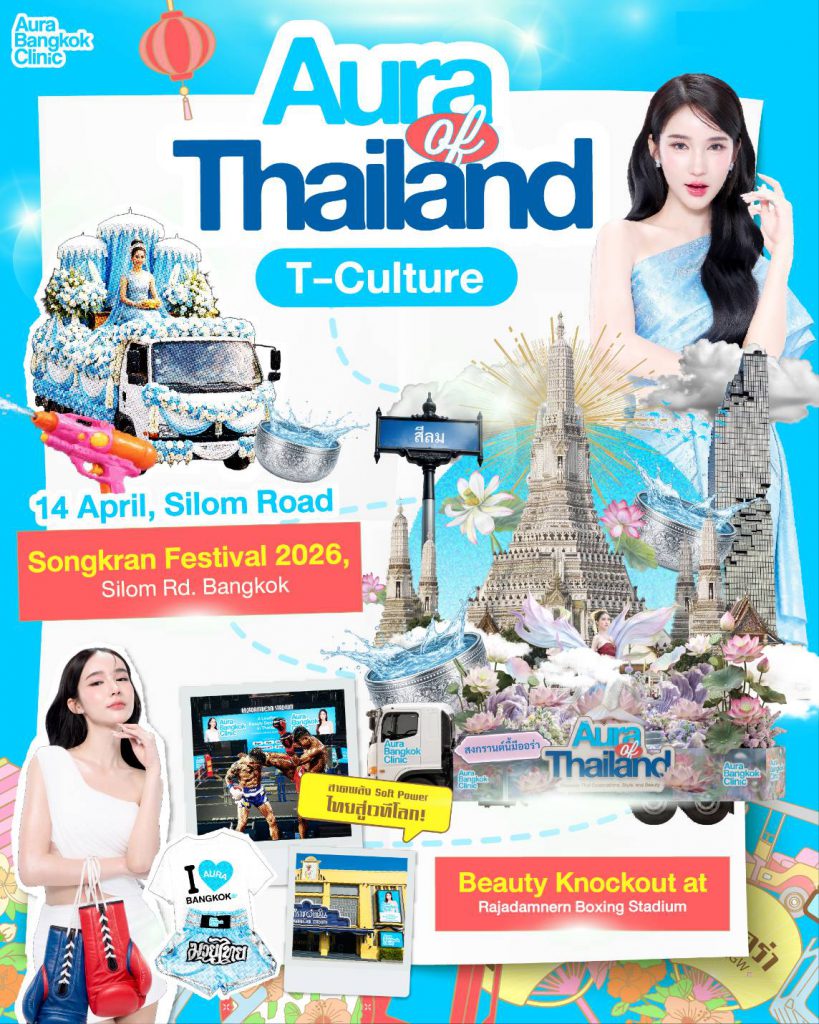 เปิดฉาก T-Culture ด้วยขบวน “นางสงกรานต์” ในงาน Amazing Bangkok Songkran Parade 2026 บนถนนสีลม นำขบวนโดย คุณโยชิ รินรดา พรีเซนเตอร์ของ Aura Bangkok Clinic ภายใต้คอนเซปต์ “สุพรรณมัจฉา” ตัวแทนความงามจากวรรณคดีไทยที่ผสานความร่วมสมัย ถ่ายทอดภาพลักษณ์ความงามไทยสู่สายตานานาชาติ พร้อมผนึกความร่วมมือกับสนามมวยเวทีราชดำเนิน สะท้อนพลังซอฟต์พาวเวอร์ไทยในมิติใหม่ ดันประเทศไทยสู่ “Wellness Hub แห่งเอเชีย” รองรับการเติบโตของอุตสาหกรรมในอัตราเฉลี่ย (CAGR) 11% (Krungsri Research, 2026; Grand View Research, 2024) มุ่งดึงดูดนักท่องเที่ยวคุณภาพและขับเคลื่อนเศรษฐกิจไทยอย่างยั่งยืน